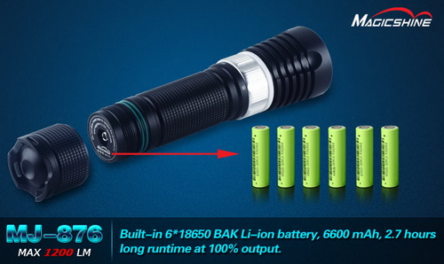 В фонаре MagicShine MJ-876 представляет собой встраиваемую кассету из 6 незащищенных Li-Ion аккумуляторов типоразмера 18650 емкостью по 2200мА каждый. Таким образом, емкость батареи при выходном напряжении 7,4В составляет 6600мАч. Производитель заявляет, что при такой емкости аккумулятора фонарь MagicShine MJ-876 проработает в максимальном режиме до 160 мин.