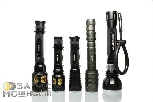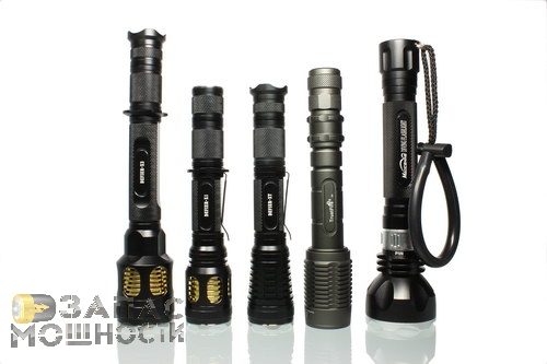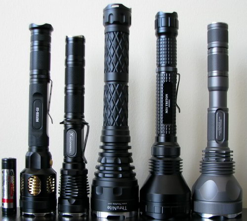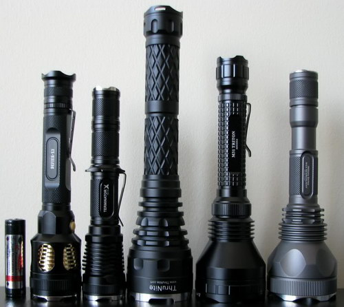 На фотографии слева-направо: AW Protected 18650, Skilhunt Defier X3 (с удлинителем), Lumintop TD-15X (с двумя удлинителями), Thrunite Catapult V3, Olight M30 (с удлинителем), JetBeam M1X V2 (с удлинителем)