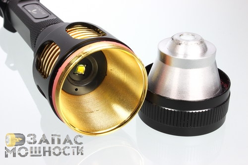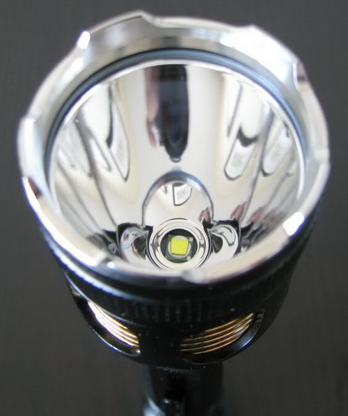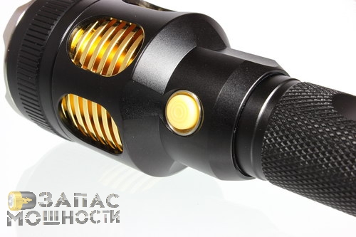 Первое, на что обращаешь внимание, это овальные вырезы в алюминиевом корпусе изголовья, сквозь которые эффектно просматриваются полированные ребра теплоотвода. Я затрудняюсь сказать, есть ли в этом какой-либо практический толк, но смотрится это здорово. На изголовье же, расположена небольшая кнопка для управления режимами работы фонаря.