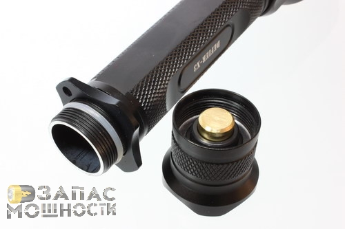Сама резьба, как и корпус, имеет защитное покрытие. Довольно крупная фаска позволяет накручивать кнопку быстро и удобно. Электрический контакт осуществляется только по торцовым поверхностям батарейного отсека,- кнопку надо закручивать до упора, иначе фонарь работать не будет.