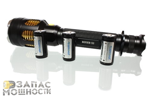 В отличии от многих моделей фонарей Fenix, которые не могут работать на аккумуляторах 16340, длина которых превышает 34мм, SkilHunt Defier X3 преспокойно "съел" 3 Li-Ion аккумулятора KeepPower 16340 700мАч, дли на которых составляет около 36мм.