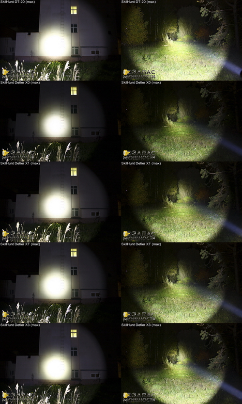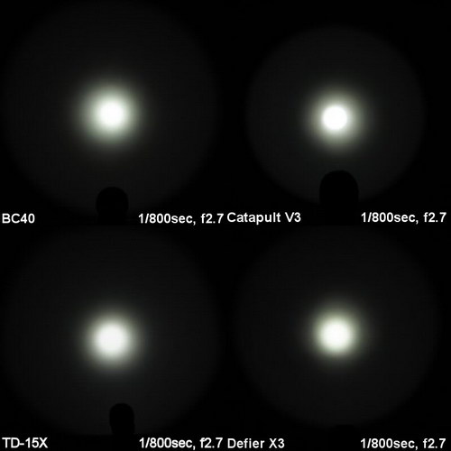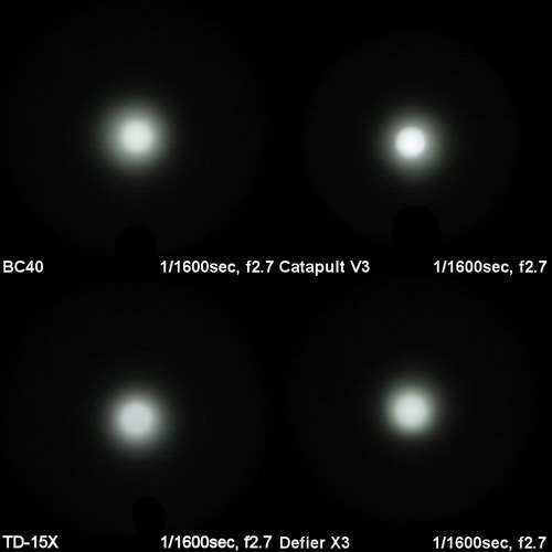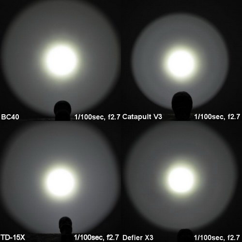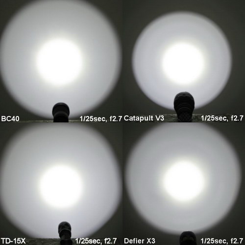 Ниже приведены сравнительные фотографии световых пятен фонарей Jetbeam BC40, Thrunite Catapult V3, Lumintop TD-15X и SkilHunt Defier X3. Фотографии были взяты из англоязычного обзора http://www.candlepowerforums.com/vb/showthread.php?316870