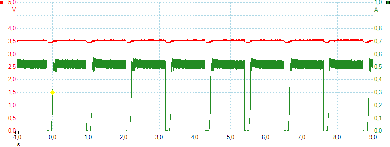 Рассмотрев график тока в сильном приближении видно, что XTAR WP2 II каждую секунду останавливает заряд для измерения напряжения на аккумуляторе. Преимущество данного метода состоит в том, что исключается влияние внутренней схемы зарядного устройства на значение измеренного напряжения на аккумуляторе.