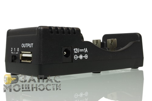 Работает зарядное устройство XTAR WP2 II от напряжения 12В. Гнездо для штыревого разъема питания находится на одной из боковых граней.