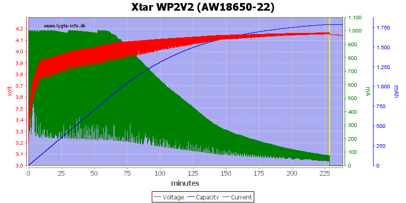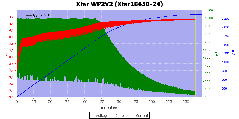 Зарядное устройство XTAR WP2 II показывает хорошее приближение к CC/CV профилю. Процесс заряда останавливается немного ранее, чем напряжение на аккумуляторе достигнет 4,2В. Пусть это немного недозаряжает аккумуляторы, но может продлить их срок службы.