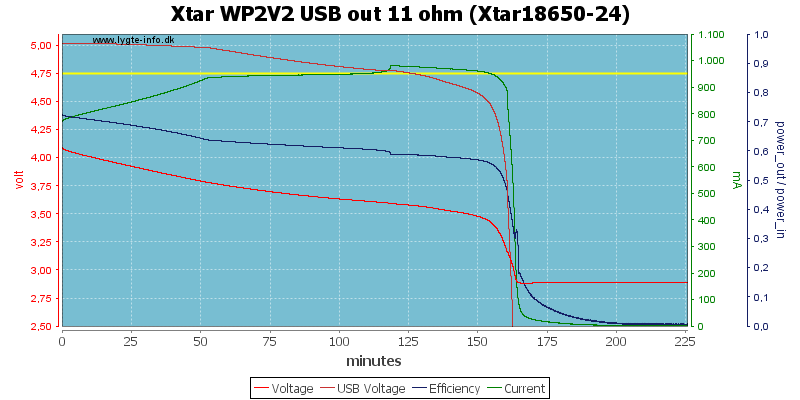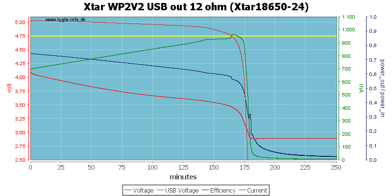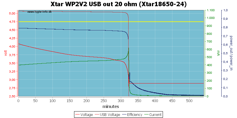 На графике выше иллюстрирован разряд нагрузкой 20Ом, что дает ток разряда равный 250мА. На USB выходе держалось напряжение 5В пока напряжение на Li-Ion аккумуляторе не упало приблизительно до 3В. При этом, зарядное устройство не выключилось полностью- аккумулятор постепенно разряжался до 2,8В и только затем отключился. Время работы USB выхода составило около 5,5 часов.
