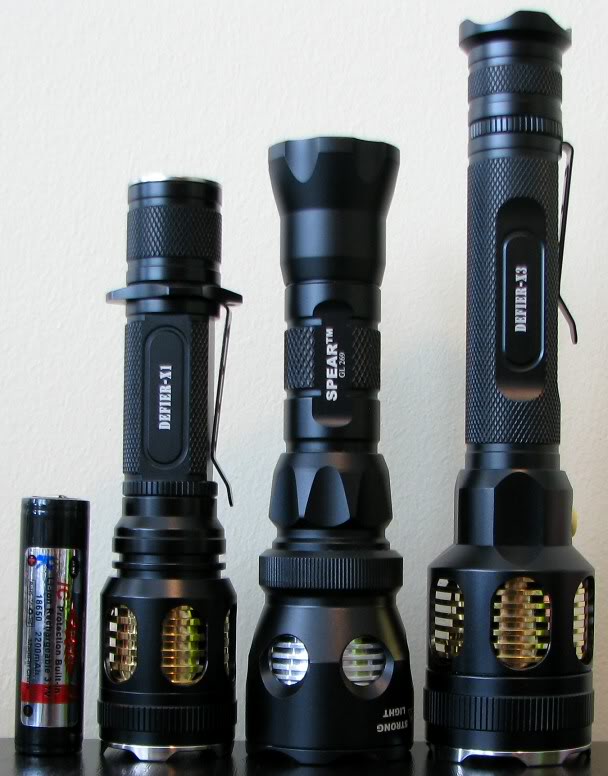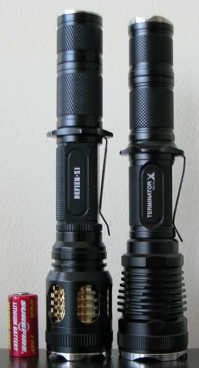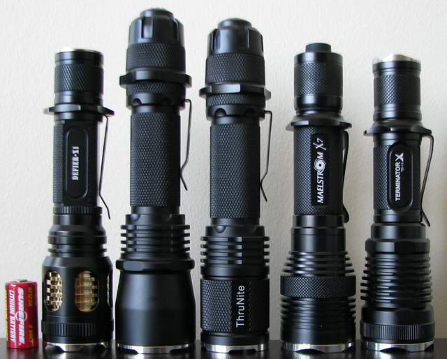 На фотографии ниже слева-направо: батарейка Surefire CR123A, фонари Skilhunt Defier X1 (без удлинителя), Thrunite Scorpion V2 Turbo, Thrunite Scorpion V1, 4Sevens X7, Lumintop TD-15X
