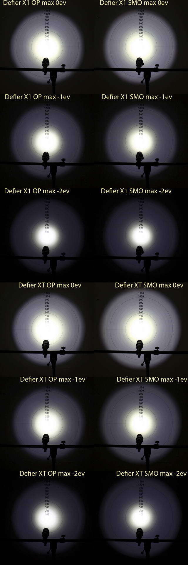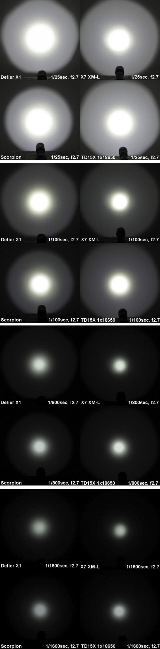 Ниже приведены сравнительные фотографии световых пятен фонарей Skilhunt Defier X1 (с OP-рефлектором), Thrunite Scorpion V2 Turbo, 4Sevens X7, Lumintop TD-15X (Фотографии были взяты из англоязычного обзора http://www.candlepowerforums.com/vb/showthread.php?316814)