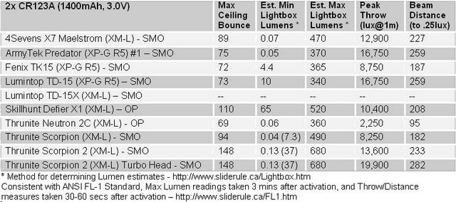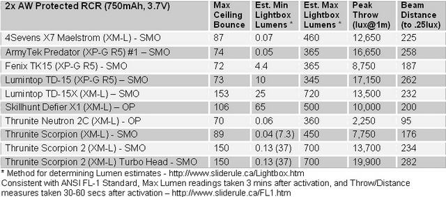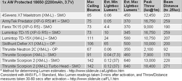Автор обзора проводил тестирование на самодельном light box`е. Все фонари тестировались с дополнительным охлаждением вентилятором. Методика преобразования значений, полученных в лайтбоксе в Люмены описана здесь: http://www.candlepowerforums.com/vb/showthread.php?301459-How-to-convert-Selfbuilt-s-Lightbox-values-to-Lumens