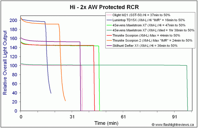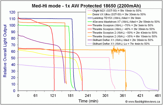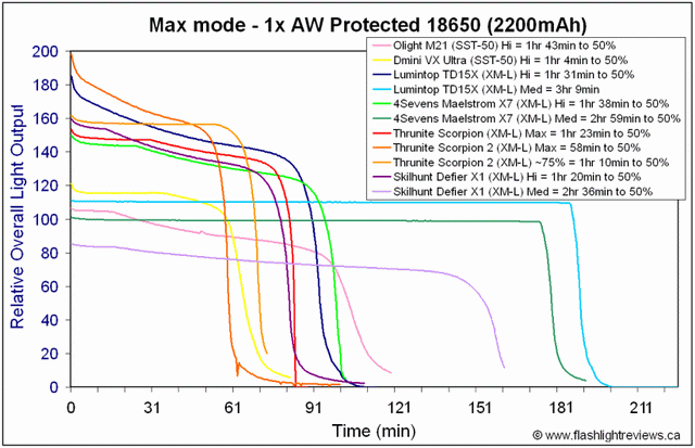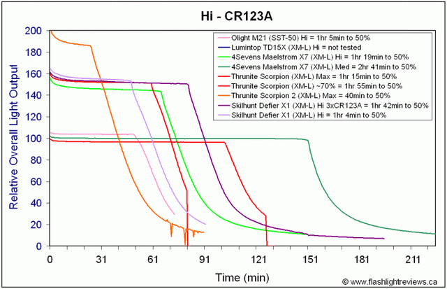 (Таблицы были взяты с англоязычного обзора фонаря модели SkilHunt Defier X1: http://www.candlepowerforums.com/vb/showthread.php?316814)