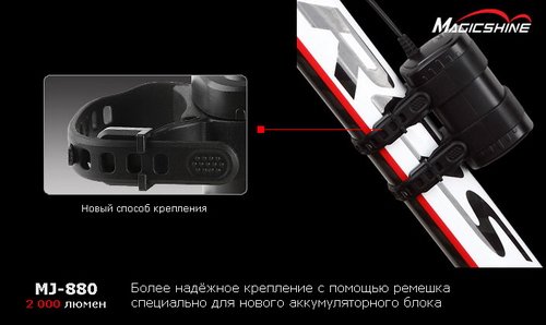 Таким образом, фару MagicShine MJ-880 невозможно подключить к аккумуляторным блокам, имеющим обычный «круглый» разъем. Сделано это, вероятно, из-за того, чтобы аккумулятор от MJ-880 можно было зарядить только при помощи зарядного устройства, которое специально предназначено для заряда аккумулятора большой емкости (напомним, что аккумулятор MJ-880 имеет ёмкость 6600мАч, в отличие от остальных аккумуляторных блоков емкостью 2200 и 4400мАч).