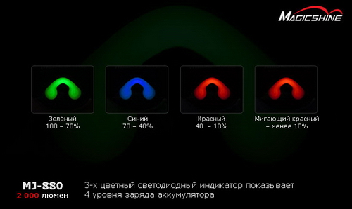 Эта кнопка выполняет функции управления фонарем и индикатора уровня напряжения аккумулятора,- цвет кнопки меняется от зеленого до красного в зависимости от величины заряда аккумулятора.