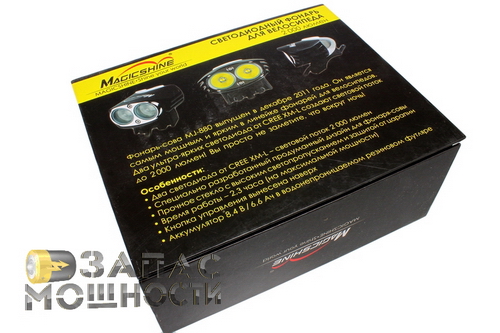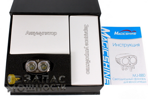 Фара MagicShine MJ-880 упакована в поролон, а аккумулятор и зарядное устройство уложены в отдельные коробки с соответствующими обозначениями. Кроме того, в общей коробке мы можем найти и инструкцию на русском языке по использованию фары.