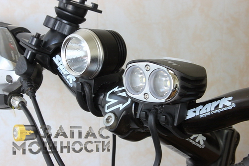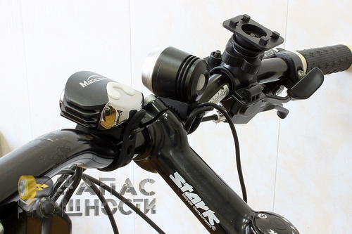 На руле закреплены 2 фары: Слева (дальняя) MagicShine MJ-838, а справа (ближняя)- MagicShine MJ-880. Комментарии, как говорится, излишни. И это при том, что вело-фонарь MJ-838 является одним из самых маломощных в линейке фонарей MagicShine.