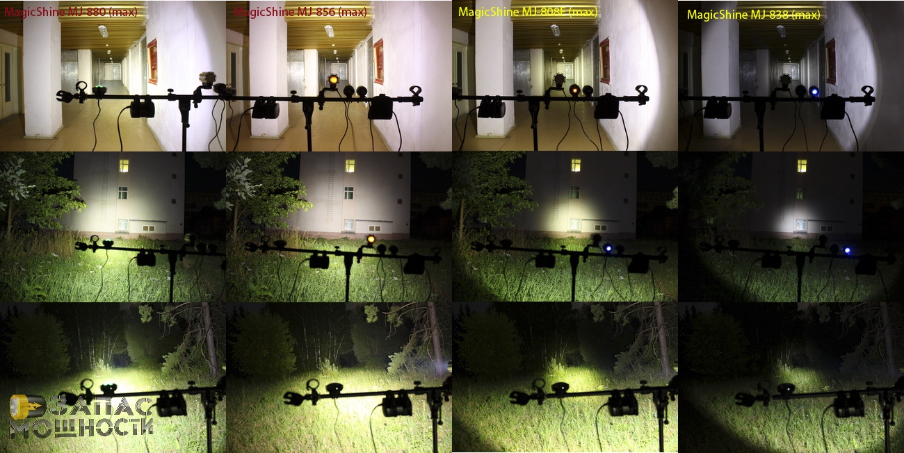 Конечно, чтобы оценить реальную яркость фонаря необходимо сравнить его с другими велосипедными фонарями. На фотографии ниже представлено сравнительное тестирование фонарей MagicShine MJ-880, MJ-856, MJ-808E и MJ-838. Все фонари работали в максимальной яркости. Экспозиция замерялась по фонарю MJ-880 и фиксировалась для снимков остальных трёх моделей.