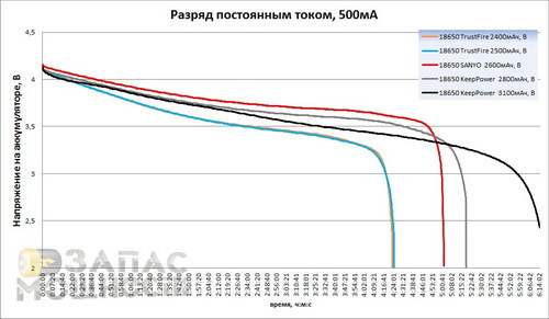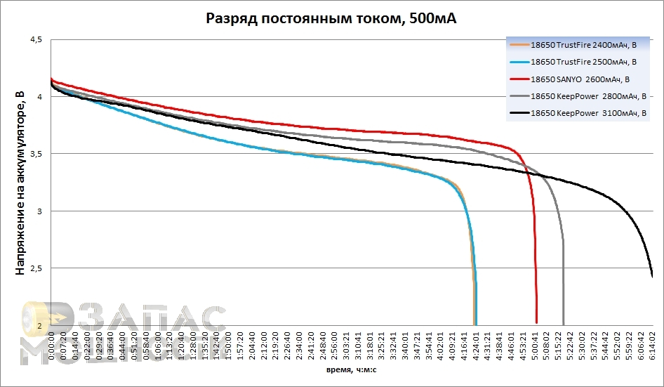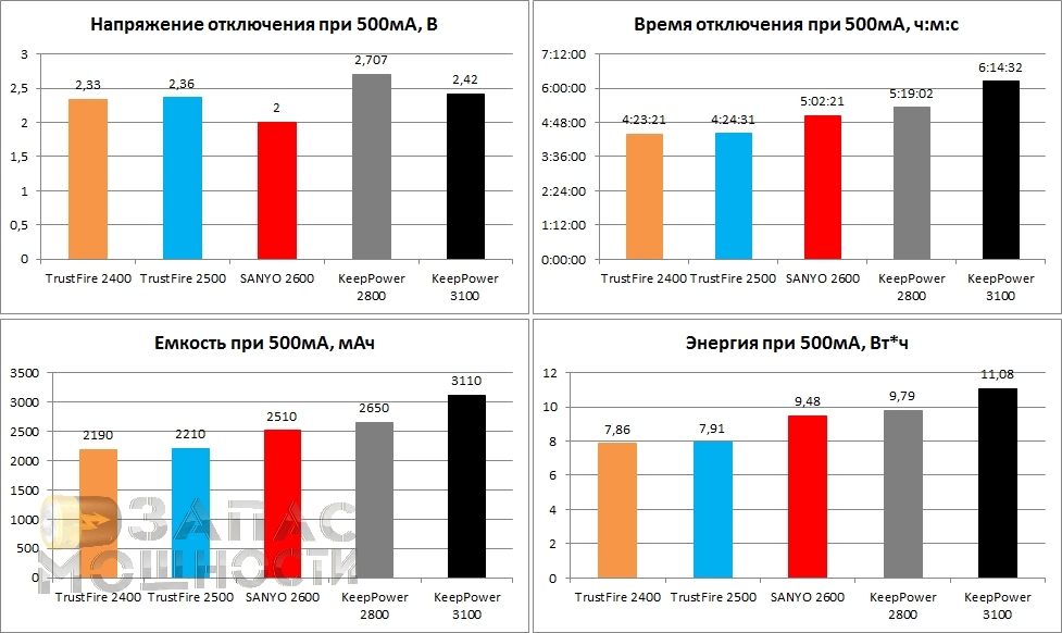 Аккумуляторы TrustFire 2400 и TrustFire 2500 демонстрируют довольно сильную разницу заявленной емкости от реальной. KeepPower 2800мАч показал, что его емкость на 100мА отличается от заявленной в меньшую сторону. А вот аккумулятор KeepPower 3100мАч показал результат, который даже немного превышает заявленный показатель. SANYO UR18650F впечатляет очень ровной кривой (извиняюсь за каламбур) напряжения.