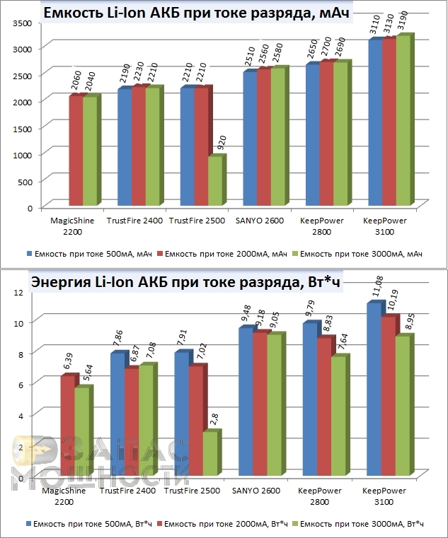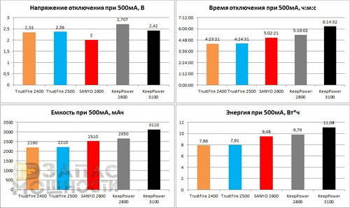 Многих может ввести в заблуждение мнимое увеличение емкости того же KeepPower 3100 при разряде током 2000мА по сравнению с разрядом током 500мА,- 3130мАч и 3100мАч соответственно. Но, как я говорил выше, емкость правильнее будет измерять не в Ампер*часах а Ватт*часах, так как последнее, также, учитывает падение напряжения на аккумуляторе а не просто время, в течении которого аккумулятор способен выдавать заданный ток. Так вот, в Ватт*часах мы видим реальную картину: емкость того же KeepPower 3100 при разряде 500мА и 2000мА составляет, соответственно, 11,08Вт*ч и 10,19Вт*ч, что полностью вписывается в теорию. Таким образом, можно сказать, что заявляя емкость своих аккумуляторов в мАч производители идут на маркетинговую хитрость, так как значения емкости в этой единице измерения ТЕОРЕТИЧЕСКИЕ, а реальные приборы, особенно цифровые, потребляют совершенно реальную (фиксированную) мощность, которая измеряется в Ваттах.
