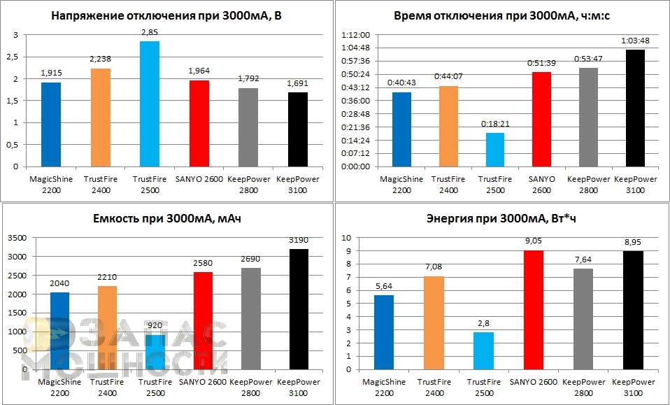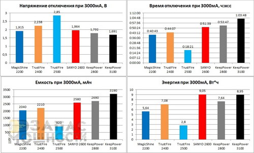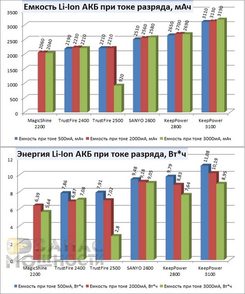 Справедливости ради, надо отметить, что Li-Ion аккумуляторы TrustFire 2400 и TrustFire 2500 на момент тестирования были уже далеко не новыми и успели послужить в качестве рабочих экземпляров в различных фонарях. Поэтому, показатели более свежих аккумуляторов этих же моделей могут отличаться.