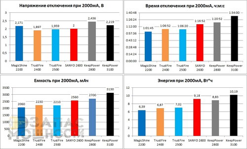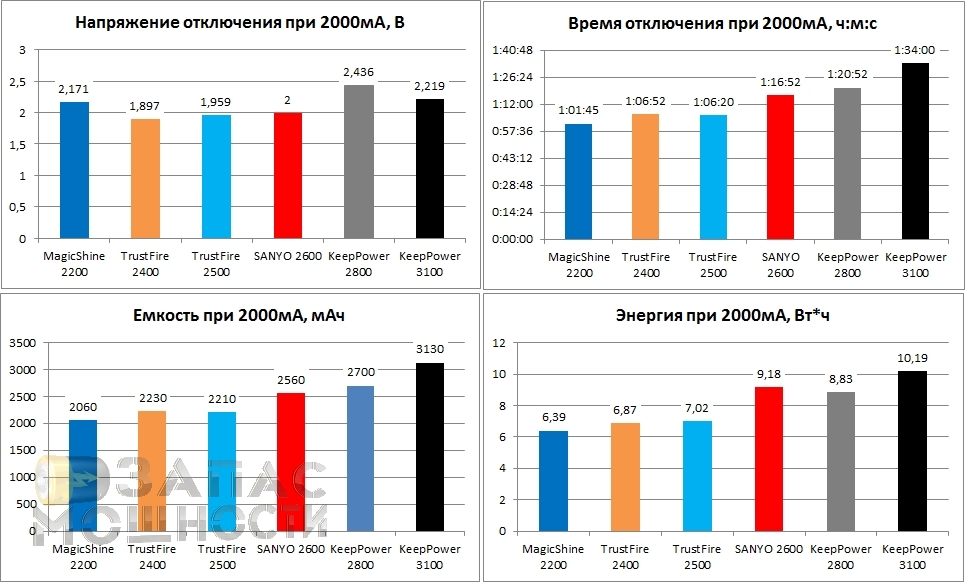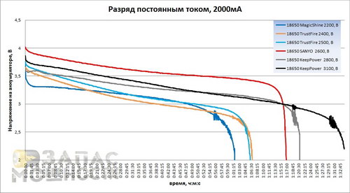 Все подопытные аккумуляторы выдержали тест достойно. MagicShine 2200 показал результат в 2060мАч. Оба TrustFire демонстрируют похожие результаты около 2200мАч. А KeepPower 3100мАч опять бьет все рекорды: 3130мАч при 2 амперах! Хотя до идеального графика SANYO им далеко. Емкость SANYO UR18650FM полностью соответствует заявленной.