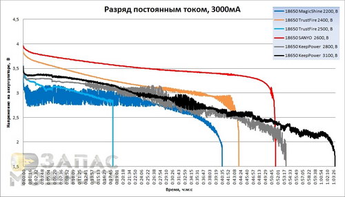 Как видно на графике, тот же самый аккумулятор KeepPower 3100 без платы защиты показывает ровную характеристику.