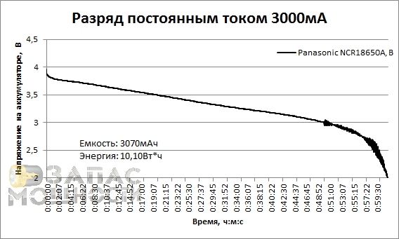 Для проверки предположения о влиянии плат защиты на кривую разряда мы отключили схему защиты в Li-Ion аккумуляторе KeepPower 3100 от ячейки, на которой он собран. График разряда током 3000мАч Li-Ion аккумулятора Panasonic NCR18650A представлен ниже.