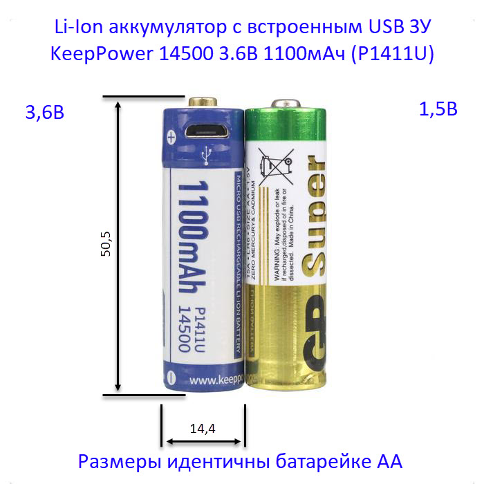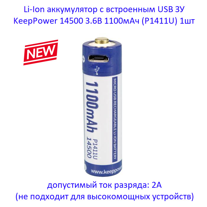 Аккумулятор KeepPower 14500 1100мАч (P1411U) можно заряжать и в "обычном" зарядном устройстве для Li-Ion аккумуляторов.