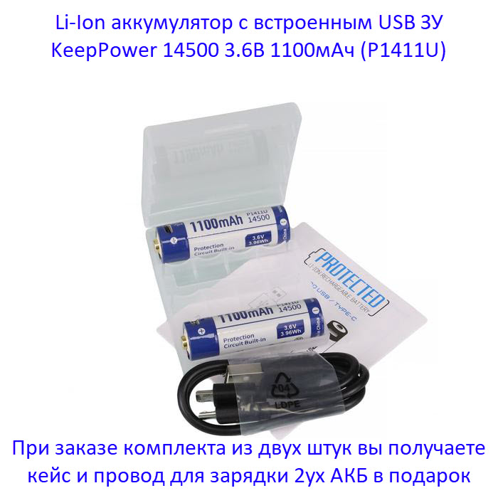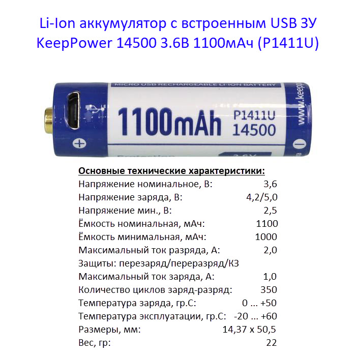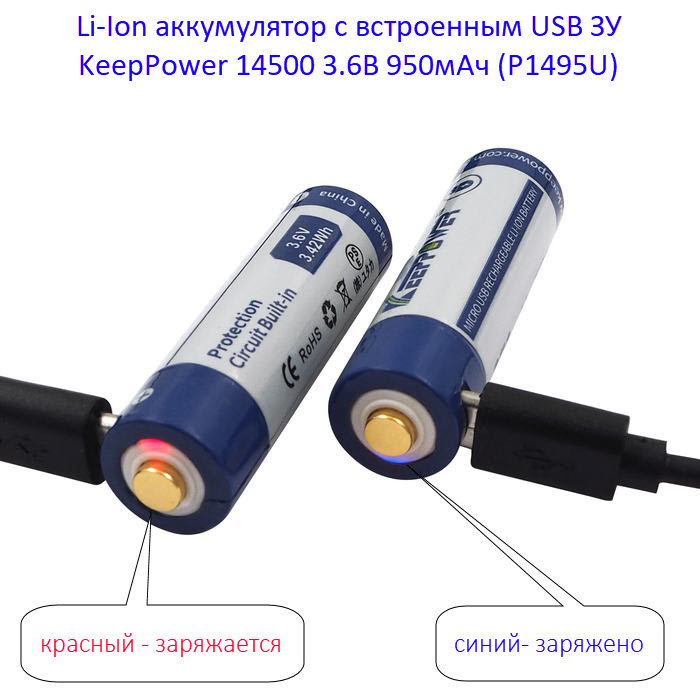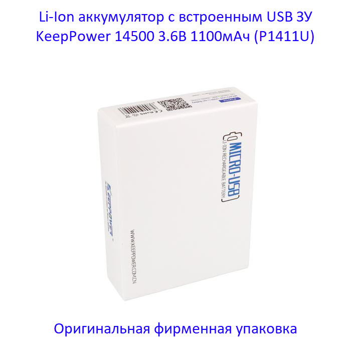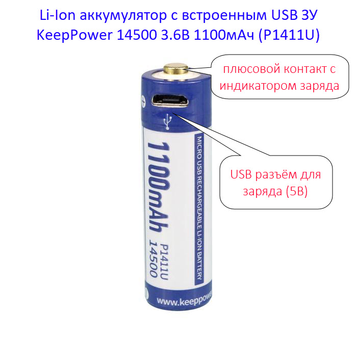Для заряда аккумулятора KeepPower 14500 1100мАч (P1411U) не нужно никаких дополнительных зарядных устройств: достаточно любого USB (5В) источника питания. В корпус аккумулятора уже встроен микроUSB разъем, как в большинстве современных смартфонах