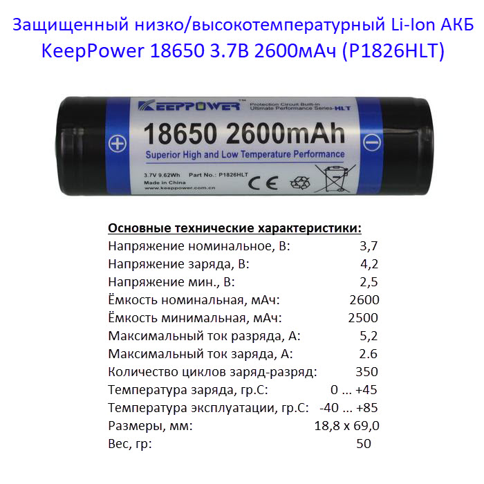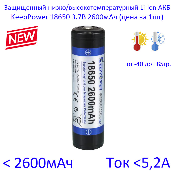 18650 2600мАч KeepPower (P1826HLT) 3,7В Защищенный низко/высокотемпературный Li-Ion аккумулятор