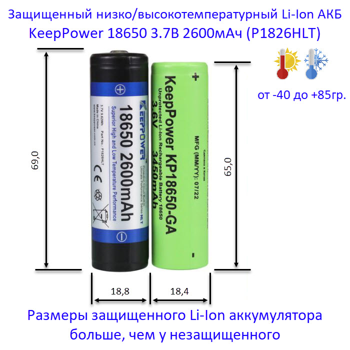 Купить оригинальные 18650 2600мАч KeepPower (P1826HLT) 3,7В Защищенный низко/высокотемпературный Li-Ion аккумулятор купить в магазине Запас Мощности фото 2