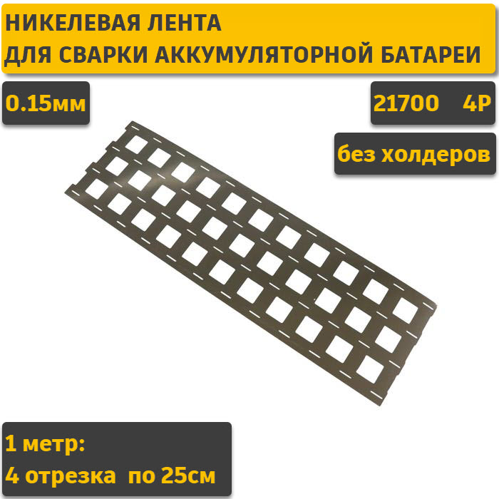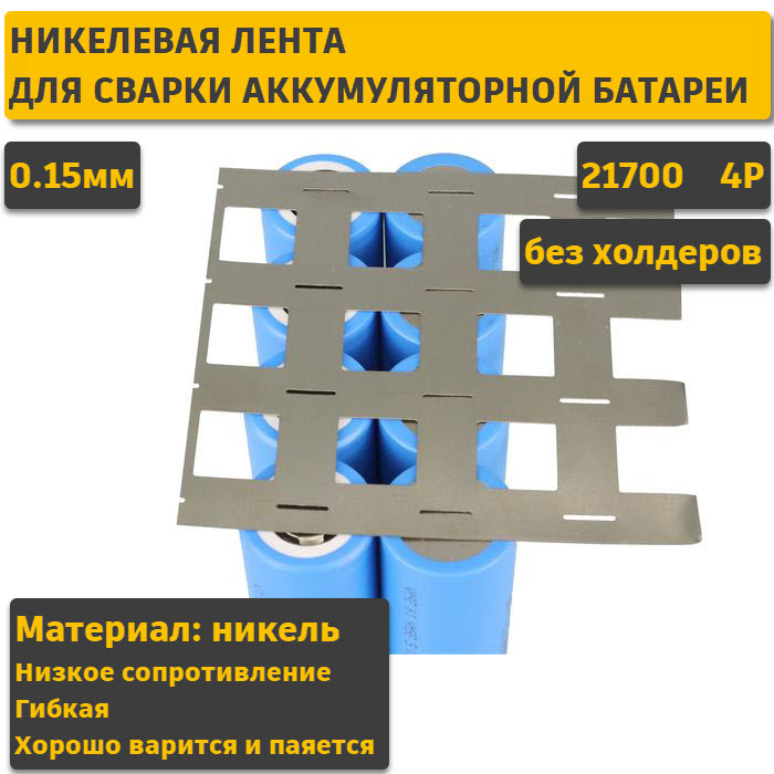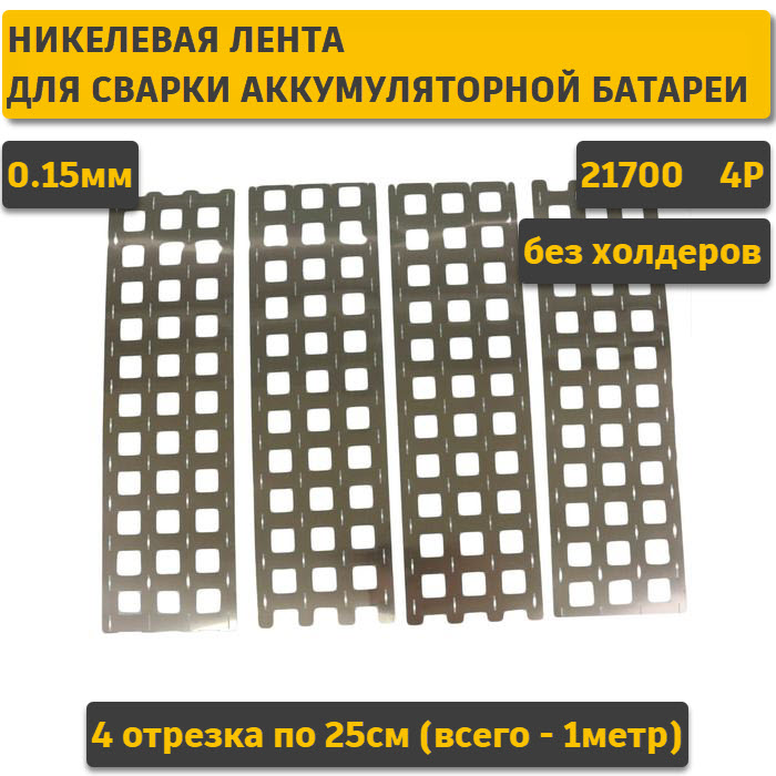 Лента для соединения Li-Ion аккумуляторов типоразмера 21700 в батареи посредством контактной сварки. Конфигурация: 4P (4 параллельные полосы без смещения) Межосевое расстояние: 21,6мм (без холдеров) Материал: чистый никель (не стальная с покрытием!) Толщина ленты: 0,15мм В комплекте 1 метр ленты одним отрезом
