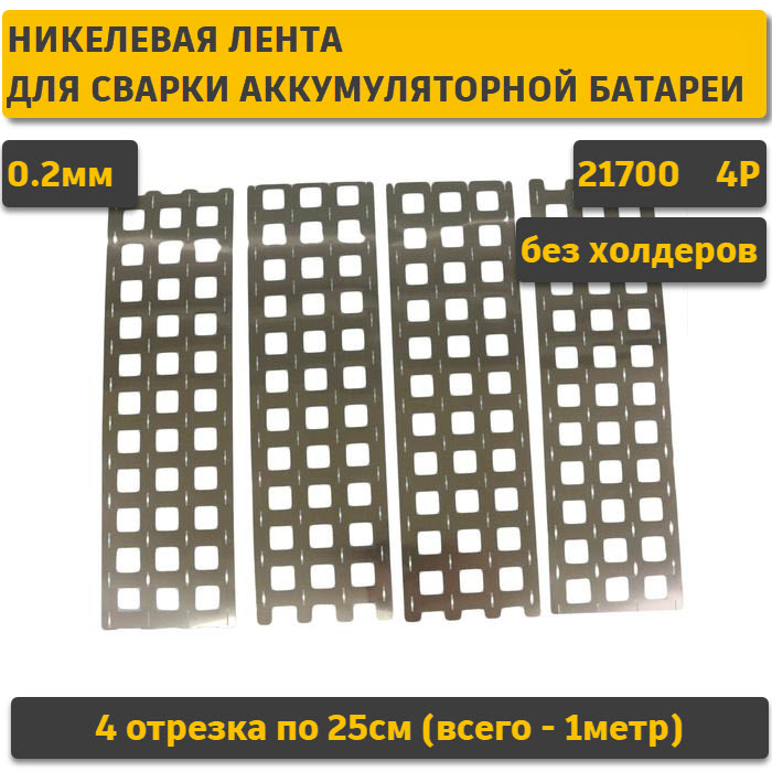 Лента для соединения Li-Ion аккумуляторов типоразмера 21700 в батареи посредством контактной сварки. Конфигурация: 4P (4 параллельные полосы без смещения) Межосевое расстояние: 21,6мм (без холдеров) Материал: чистый никель (не стальная с покрытием!) Толщина ленты: 0,2мм В комплекте 1 метр ленты одним отрезом
