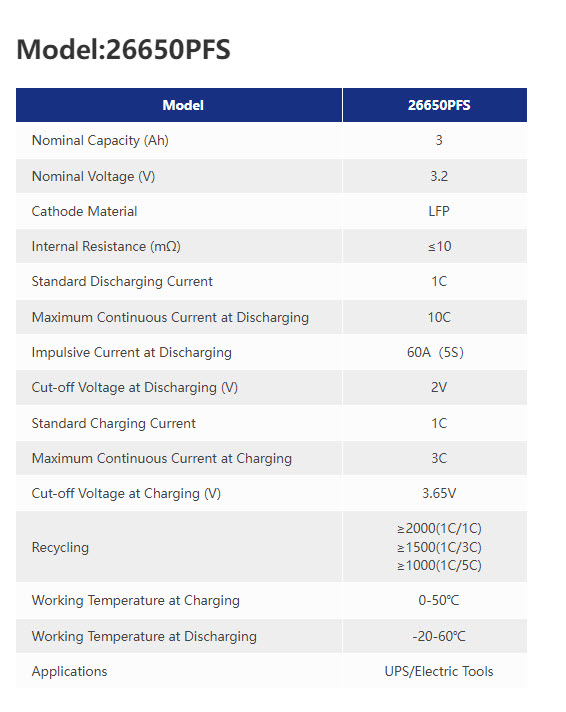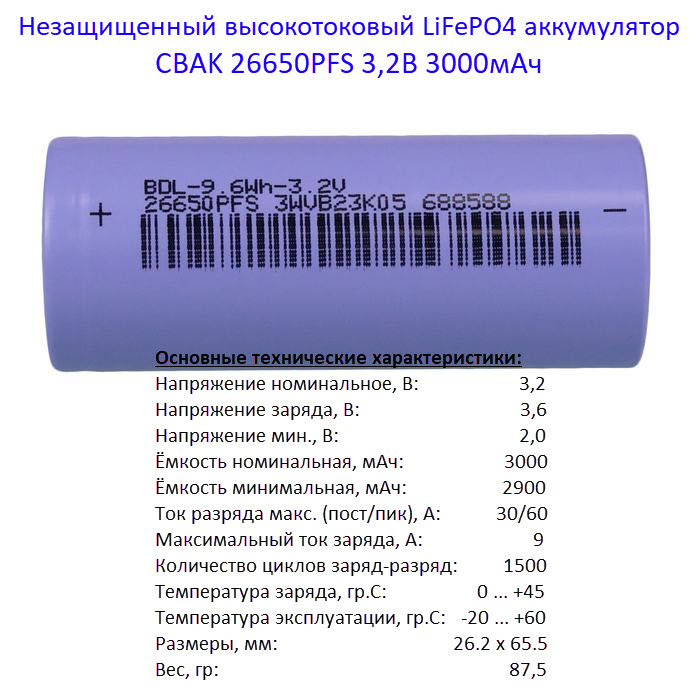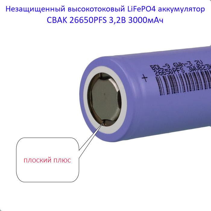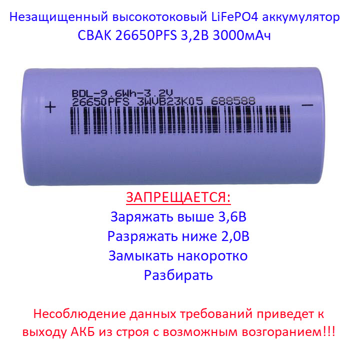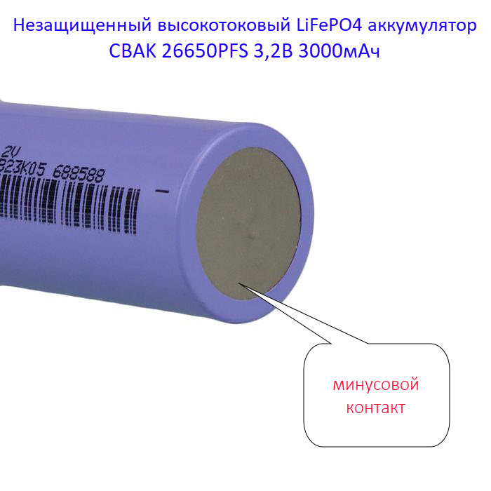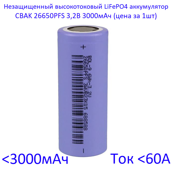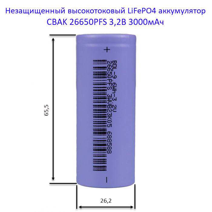 Купить оригинальный 26650 3000мАч CBAK 26650PFS 3,2В 30А незащищенный LFP АКБ высокотоковый по лучшей цене с доставкой - интернет магазин Запас Мощности.