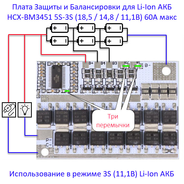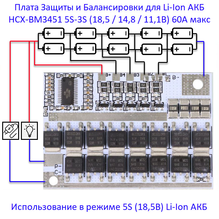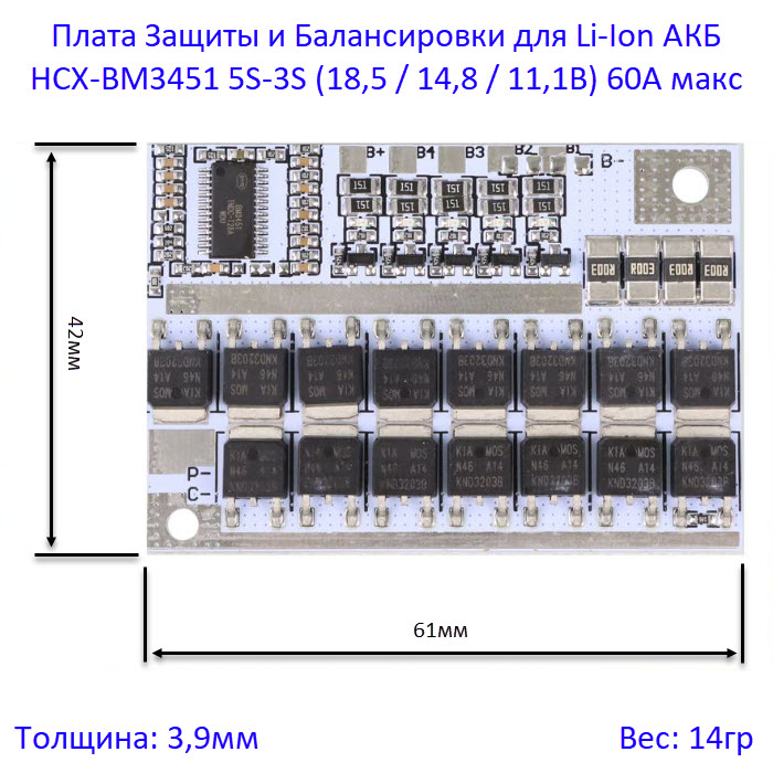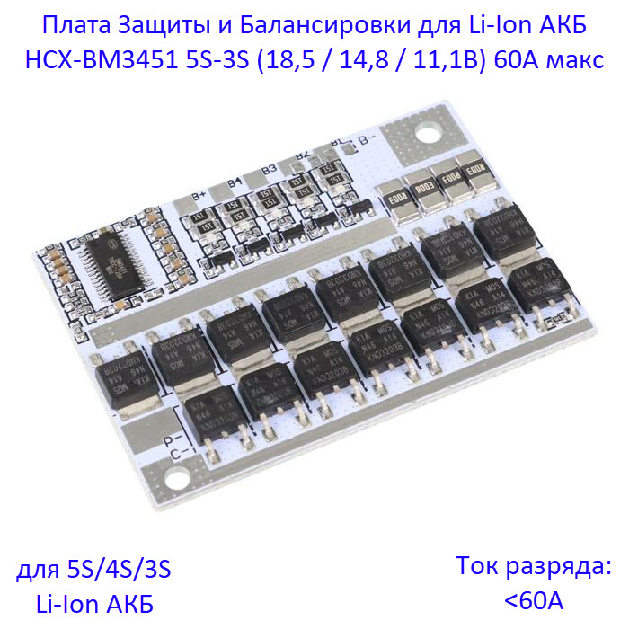 Купить оригинальные Контроллер заряда-разряда (PCM) для Li-Ion батареи 18,5В (14,8/11,1В) 60A с балансиром HCX-BM3451 по лучшей цене с доставкой - интернет магазин Запас Мощности.