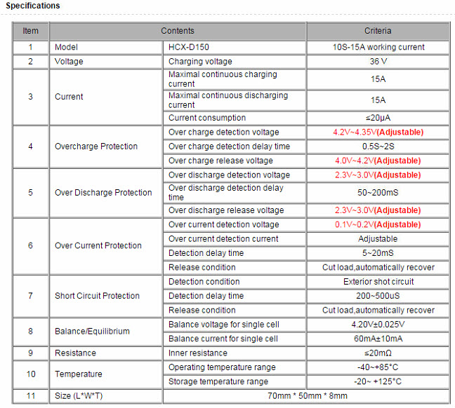 Плата контроля HCX-D150 для 10S Li-Ion батареи имеет встроенную функцию балансира. При этом, в процессе заряда батареи, напряжение на каждой из ячеек выравнивается до значения 4,2В. Для того, чтобы воспользоваться функцией выравнивания напряжения вам необходимо выдержать батарею под напряжением (в процессе заряда) не менее 90 мин после полной зарядки батареи