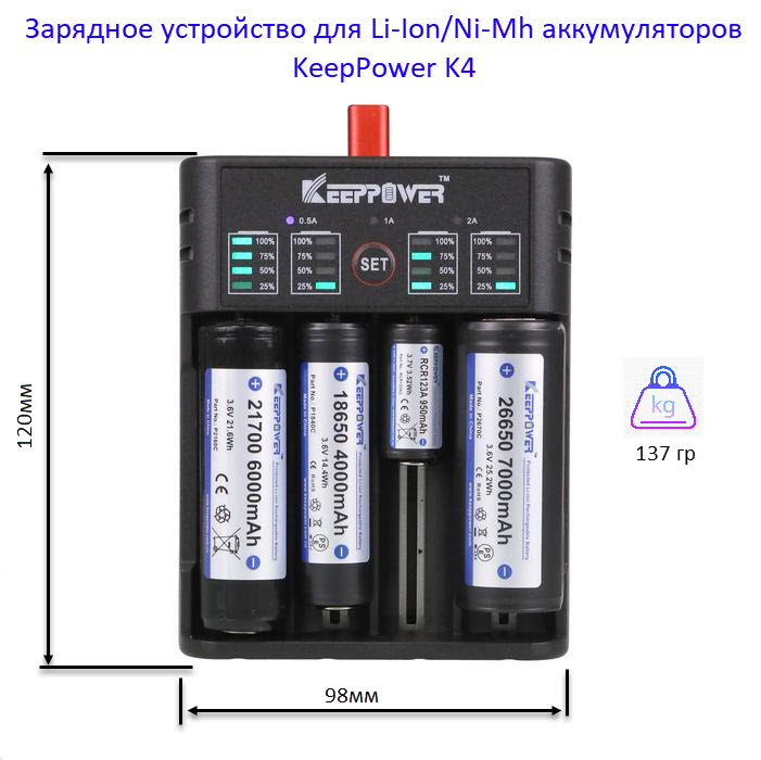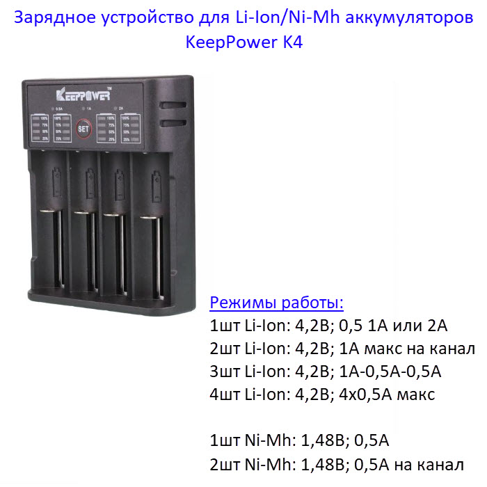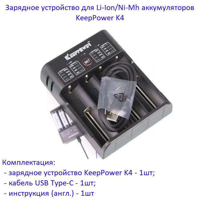 Зарядное устройство для аккумуляторных батарей Keeppower K4 - это надежное и универсальное зарядное устройство, разработанное для пользователей, которым требуется эффективная зарядка аккумуляторов различных типов. Благодаря конструкции с одним разъемом.