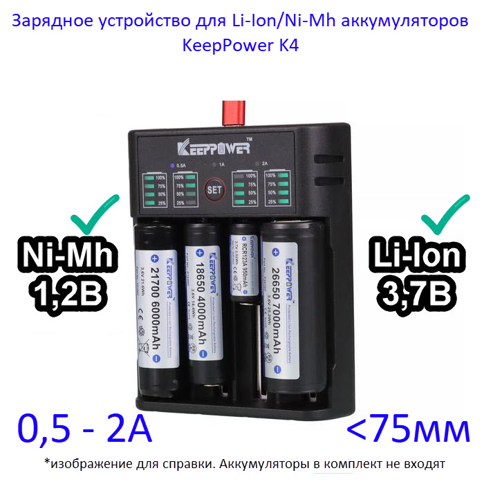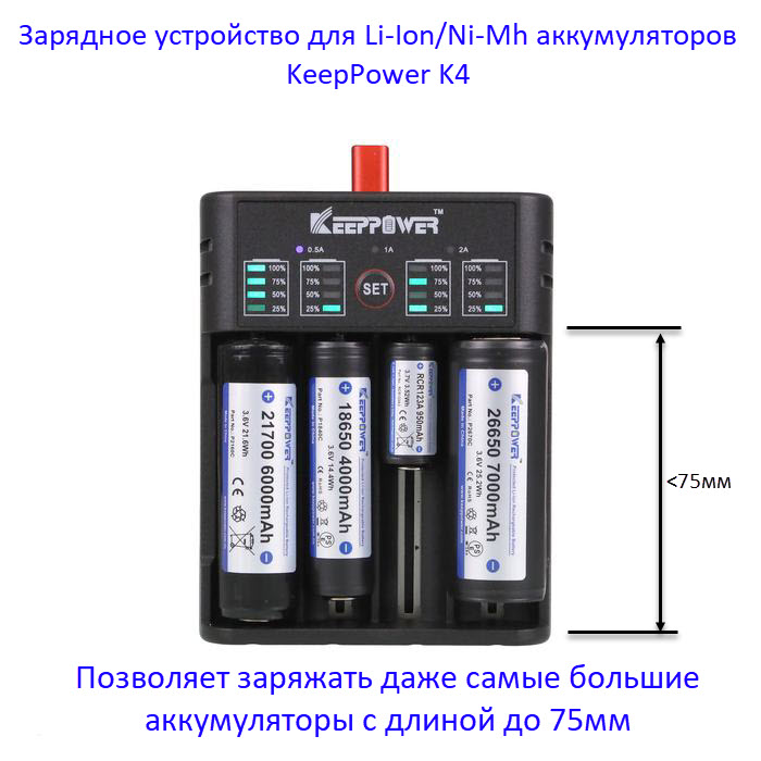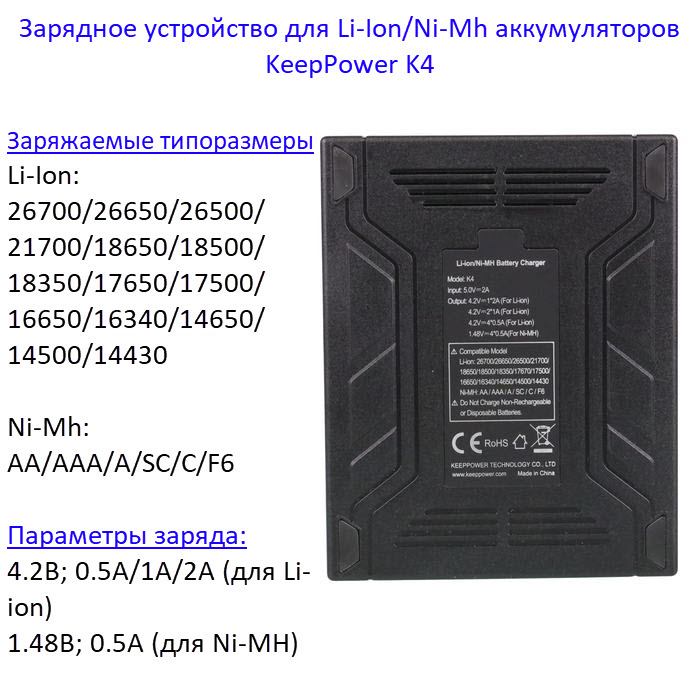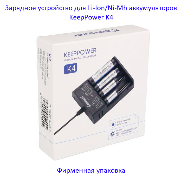 Keeppower K4 известен своей совместимостью с широким спектром типов аккумуляторов. Он подходит для литий-ионных элементов таких размеров, как 26700, 26650, 26500, 21700, 18650, 18500, 18350, 17650, 17500, 16650 и 16340. Кроме того, он поддерживает перезаряжаемые Ni-MH аккумуляторы в форматах AA, AAA, A, SC, C и F6. Такая широкая совместимость делает Keeppower K4 идеальным выбором для пользователей, которым требуется несколько вариантов аккумуляторов для фонариков, фотоаппаратов, игрушек и других портативных электронных устройств.