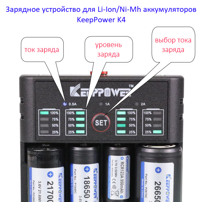 Зарядное устройство K4 обеспечивает интеллектуальное управление мощностью в зависимости от типа батареи. Оно предлагает три варианта зарядного тока: 0,5 А (только для Ni-Mh), 0,5А,1 А и 2 А при выходном напряжении 4,20 В. Это гарантирует, что каждая батарея получает соответствующий уровень тока для эффективной и безопасной зарядки.