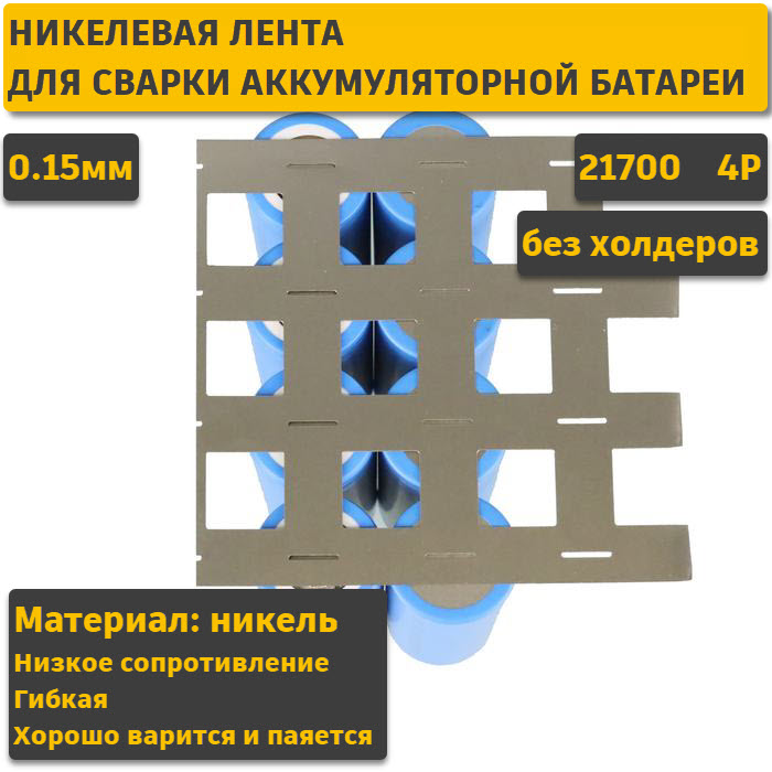 Лента для соединения Li-Ion аккумуляторов типоразмера 21700 в батареи посредством контактной сварки. Конфигурация: 4P (4 параллельные полосы без смещения) Межосевое расстояние: 21,6мм (без холдеров) Материал: чистый никель (не стальная с покрытием!) Толщина ленты: 0,15мм В комплекте 1 метр ленты одним отрезом
